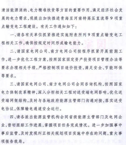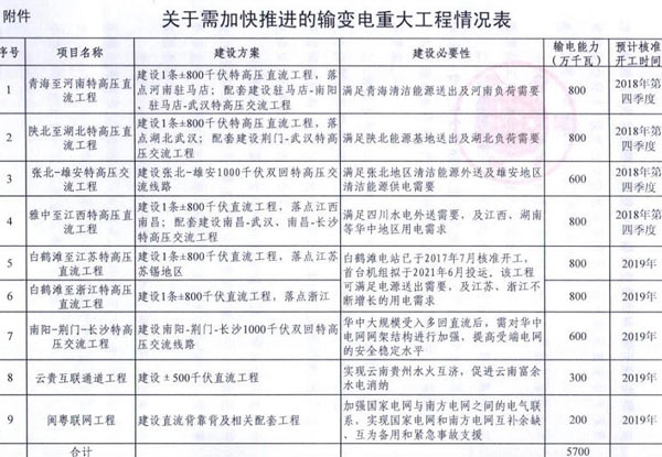 9月7日獲悉,國(guó)家能源局印發(fā)《關(guān)于加快推進(jìn)一批輸變電重點(diǎn)工程規(guī)劃建設(shè)工作的通知》國(guó)能發(fā)電力〔2018〕70號(hào),《通知》指出,為加大基礎(chǔ)設(shè)施領(lǐng)域補(bǔ)短板力度,發(fā)揮重點(diǎn)電網(wǎng)工程在優(yōu)化投資結(jié)構(gòu)、清潔能源消納、電力精準(zhǔn)扶貧等方面的重要作用,加快推進(jìn)青海至河南特高壓直流、白鶴灘至江蘇、白鶴灘至浙江特高壓直流等9項(xiàng)重點(diǎn)輸變電工程建設(shè),合計(jì)輸電能力5700萬千瓦(工程見附件)。