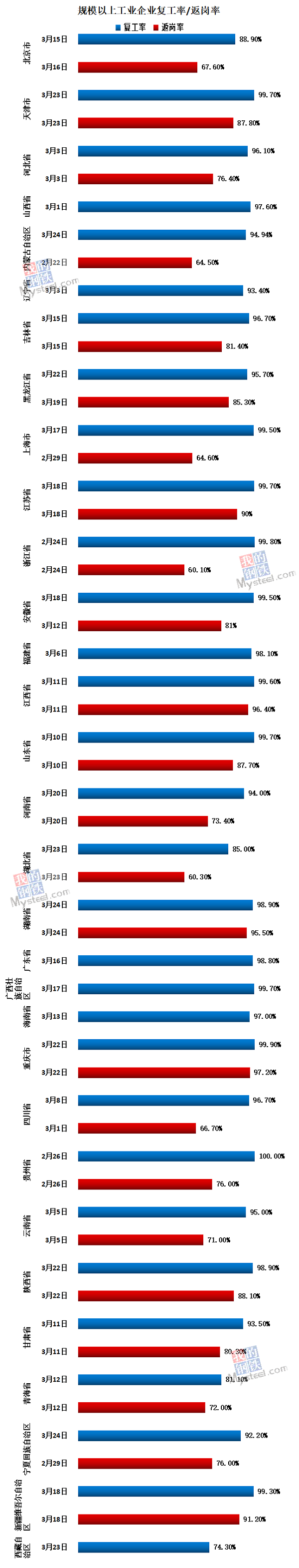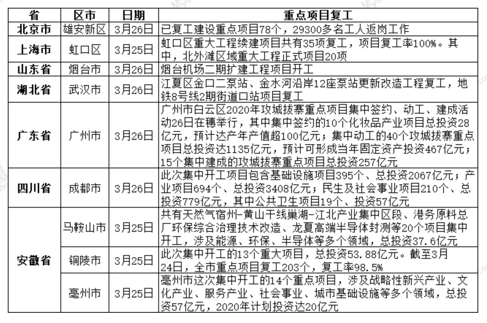 Mysteel統(tǒng)計數(shù)據(jù)顯示,截至3月26日,27省市規(guī)模以上工業(yè)企業(yè)復(fù)工率超過90%,江蘇、江西、湖南、重慶、新疆等省份人員返崗率超過90%。各地重大項目也陸續(xù)開工。